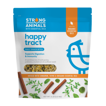 Happy Tract™ is a daily snack containing organic oregano, cinnamon and thyme essential oils, prebiotics, multi-grains, cracked corn, sunflower seeds, and flaxseed to promote digestive health and support immunity. DIRECTIONS: Feed as a top dressing or in between meals. For best results use daily. For all types of poultry. PACKAGING SIZE: 5 lbs.