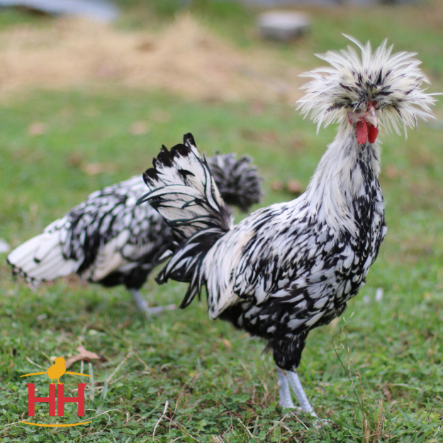 The breed is named for the Polish army's feathered caps because it resembled their feathered crests. The chickens originated in Spain and then brought to Holland, where the Dutch perfected their coloring. They became a popular bird in France, then started appearing in the U.S. around the 1830s. They are a great breed, very docile. and even-tempered. They are easily surprised due to their feathers limiting their eyesight, making them vulnerable to predators.